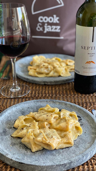 Com o Cook & Jazz, você pode mandar de surpresa um kit completo, com todos os insumos necessários para ele fazer e comer aquela comidinha especial, além de acompanhar uma bolsa térmica super útil, um prato exclusivo de pedra sabão, um vinho da Bodega Septima, uma cerveja e uma taça personalizada da Baden Baden.